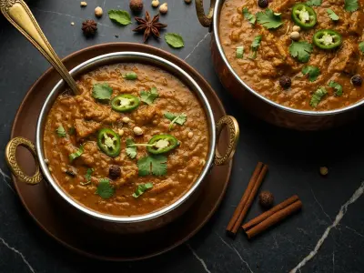 8. FINAL CHECK AND SERVING: Give the Dhansak a final stir and taste for salt. The gravy should be thick — thicker than regular dal, almost like a loose stew — and should coat the back of a chamcha (spoon). If it's too thick, add a splash of hot water and stir. Serve in a deep bartan with the caramelised brown rice on one side and the Dhansak gravy and meat ladled over and beside it. Eat together — the rice, the gravy, the tender mutton, all in the same spoonful. HINT: Dhansak tastes dramatically better the next day after the flavours have had time to meld overnight. Make it a day ahead if you can — this is a dish that rewards patience. Finish with a squeeze of fresh lemon over individual servings.