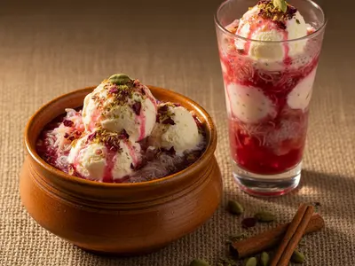 When it reached the Mughal court it was transformed into the elaborate layered drink-dessert known today, with basil seeds (sabza), milk, and ice cream added over time. Stacked in tall glasses at every Burns Road chowk stall and ice cream parlour, this is the dessert that drinks — or the drink that's also a dessert. Nobody's sure. The layers are non-negotiable: rose syrup at the base for colour and sweetness, chilled milk for creaminess, basil seeds (tukmaria) that expand into these amazing gel-encased pearls, boiled falooda sev (thin vermicelli), and a scoop of vanilla ice cream perched on top like a crown. Fun fact: falooda has Persian roots — it was originally a frozen noodle dessert called 'faloodeh' from Shiraz. It traveled to the subcontinent via Mughal kitchens and evolved into the over-the-top dessert drink Pakistan made it. Nobody does it better than Karachi. But you can try at home.